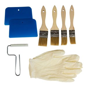 - Fibre Glast Quart Starter Kit (plastic roller with wire handle, ½-inch diameter x 3-inch wide; 1-inch brushes, 2 qty; 1-½-inch brushes, 2 qty; squeegees, 2 qty; latex gloves, 4 pairs)